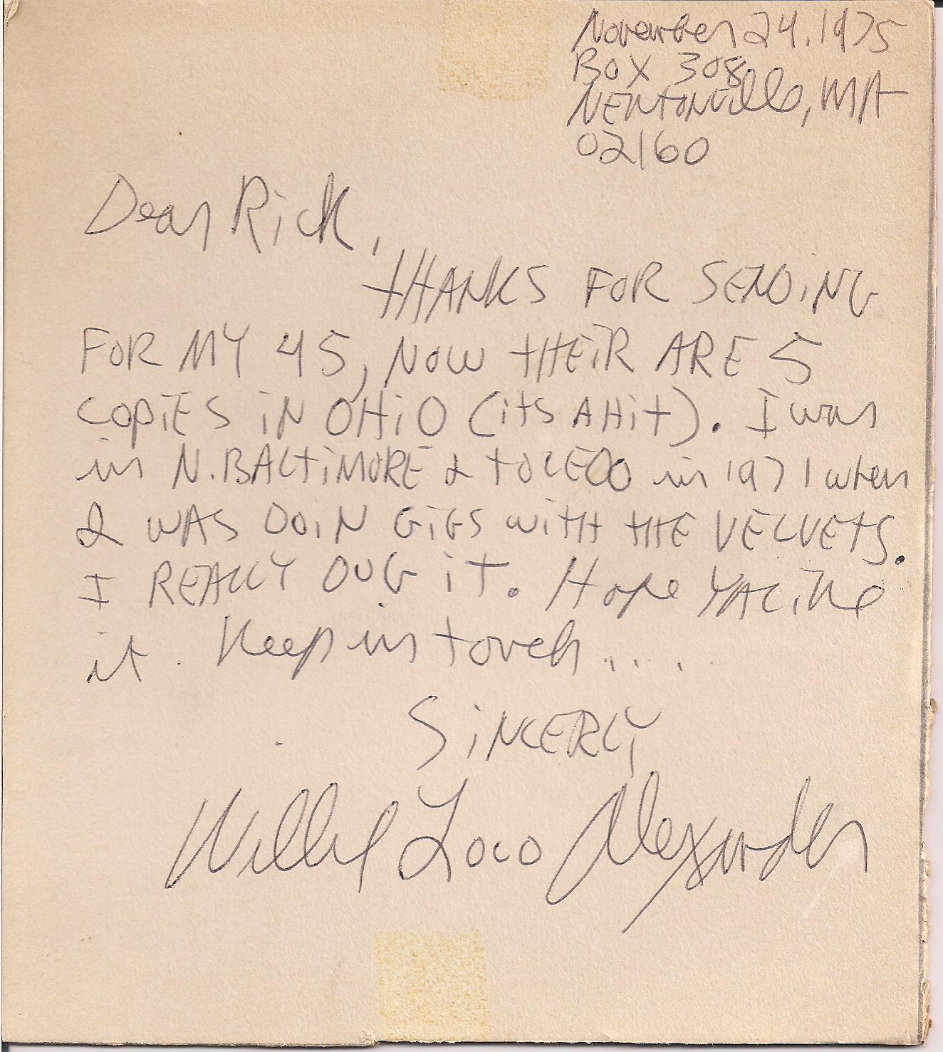 It's a pretty simple concept: back in the day, at the dawn of time, say 1974 or so, when KISS had barely been invented, and Colin was 5 years old, I was sending away for 45 rpm punk singles through the mail. (iPhone kids, ask your parents what 45 rpm singles were; ask your grandparents what "mail" was.) The first one I sent away for was Patti Smith's "Hey Joe" b/w "Piss Factory." The second was Boston rock & roll genius Willie "Loco" Alexander's "Kerouac" b/w "Mass Ave." When I got it, at my second apartment ever, back in the old Lincoln Park West Apartments - that complex right across from the Hollywood Casino that I believe set a city record for most police runs last year - it contained this note from Alexander.......