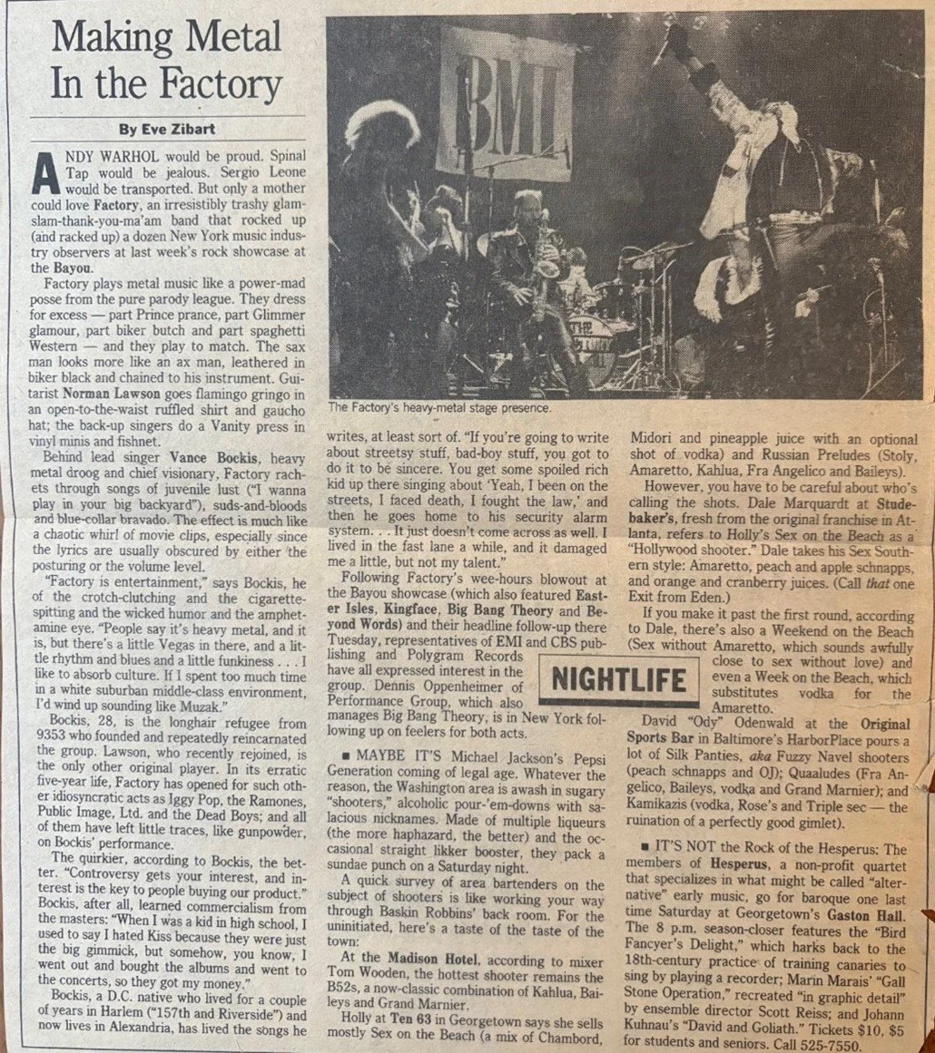 The Factory was a swaggering, bluesy, punk-tinged, metal band from the stomping grounds of my youth; the Nation’s Capital. Band members included Vance Bockis (vocals), Robbie Limon (guitar), Bruce Katsu (lead guitar), Scott Sartorius (bass), Mark Kermanj (drums) and Willie Massey (saxophone). I LOVED The Factory. They embodied everything I love in rock n’ roll - they had the looks, the sound, the style, the whole package. Here’s my story about the greatest band that you’ve never heard. This is going to take some time…..